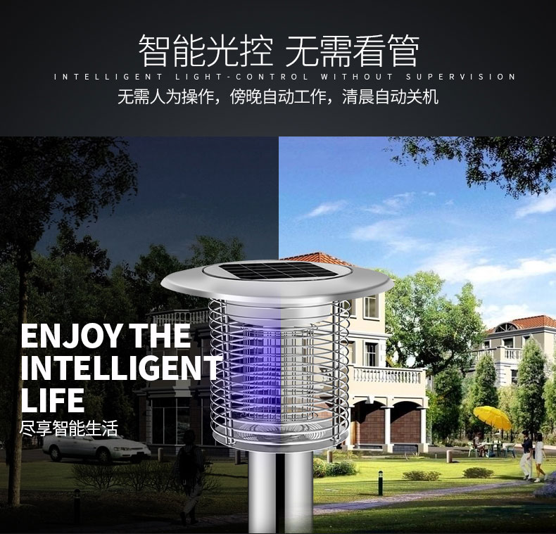 2、智能光控,白天自動(dòng)充電,晚上開(kāi)啟滅蚊,無(wú)需看管。